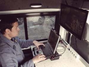 Внутри фургона находится компьютер, который задает беспилотнику координаты полета. Второй монитор транслирует видео с камеры, прикрепленной к аппарату.