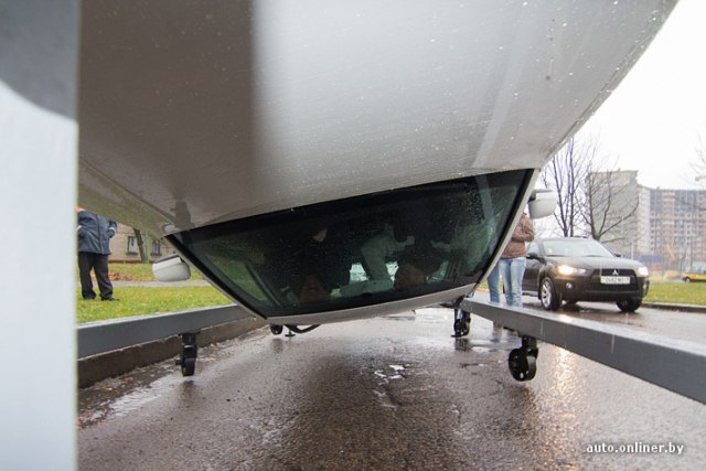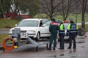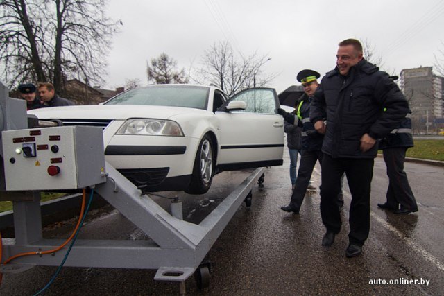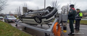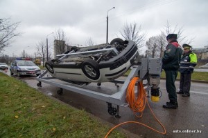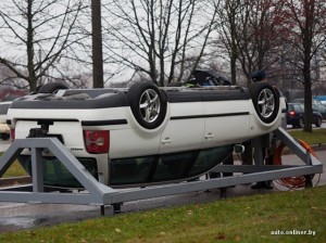 Сегодня днем Минская ГАИ провела необычную акцию. Сотрудники Госавтоинспекции предлагали автолюбителям испытать, каково это — оказаться в переворачивающемся автомобиле. Обязательными условиями участия были хорошее здоровье и пристегнутый ремень безопасности. Тренажер на базе Volkswagen Passat B5 предоставили в МЧС. Таким образом инспекторы хотели показать минчанам, с одной стороны, что чувствует человек, попавший в ДТП с переворачиванием, а с другой — насколько важно всегда пристегиваться.