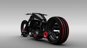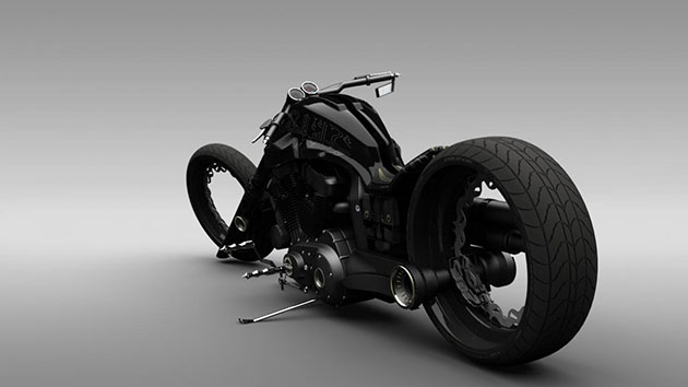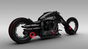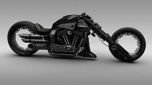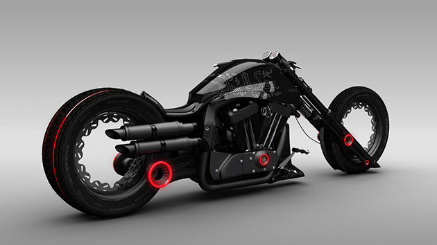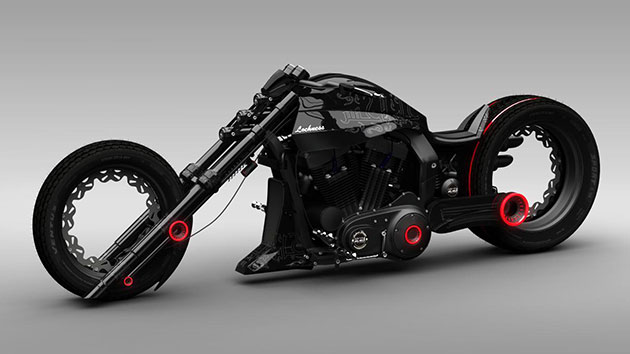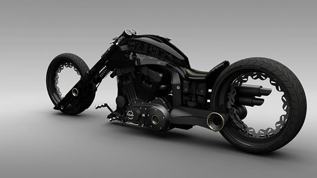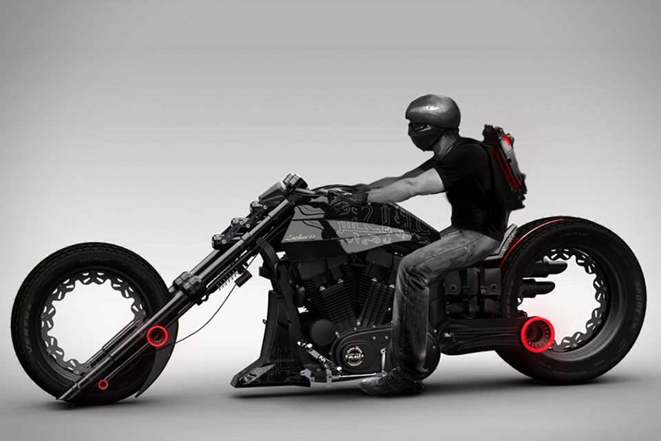 Сей болид выделяется очень длинной колесной базой и использованием безосевых колес, которым специалисты пророчат большое будущее. Более того, заднее колесо фактически разделено на два, и трансмиссия передает на него крутящий момент через центральную часть. К тому же в заднее колесо встроено несколько светодиодных лент, которые исполняют роль сигнальных ламп. Фантастический концепт, читать о котором бесполезно, надо его видеть. Глядишь, и лет через пять-десять такие мотоциклы станут стандартом де-факто.